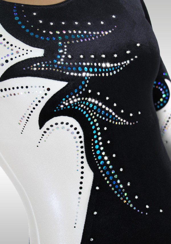 Turnpakje in wit wetlook met zwart velours gecombineerd. Een mooi patroon van turquoise en zilveren pailletten op de voor- en achterkant. Bijpassende broekjes beginnen met de letter P.
